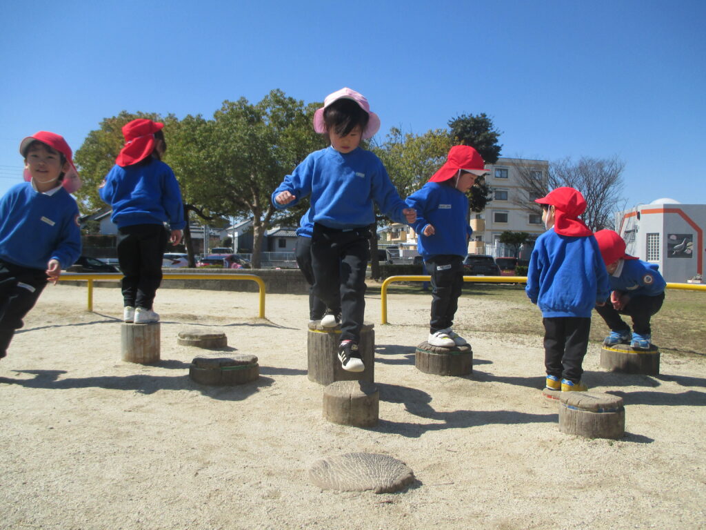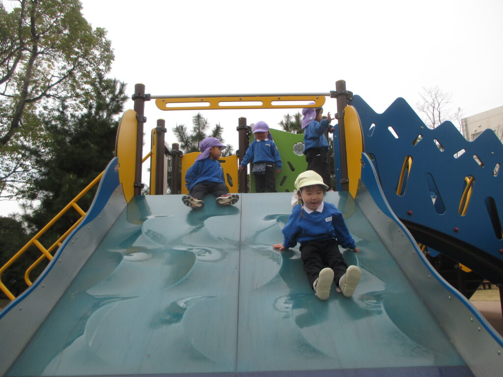 長い滑り台やタイヤ、吊り橋、丸太の飛び石などで、思い切り体を動かして過ごしました。