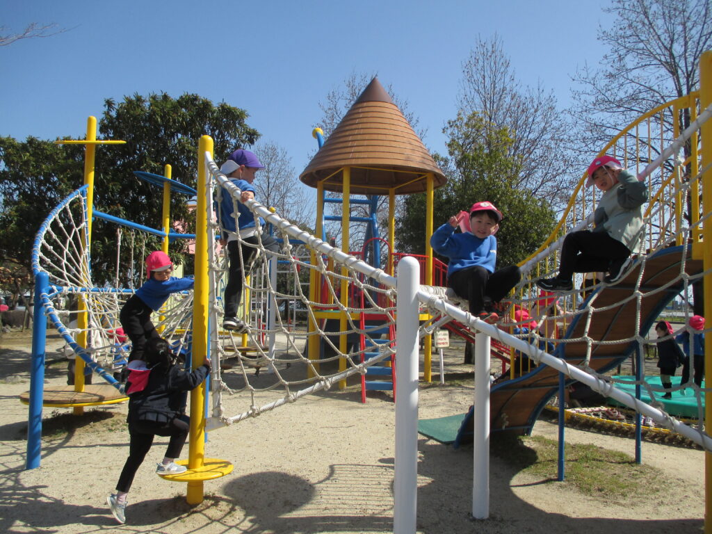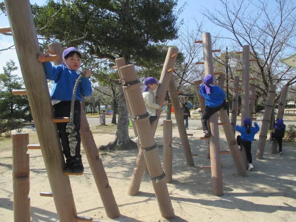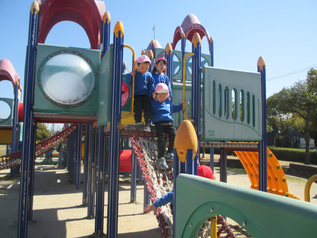 「先生見て!ここまで登れたよ!」「次はこっちに挑戦してみる!」と様々な遊具で遊ぶことを楽しみました。