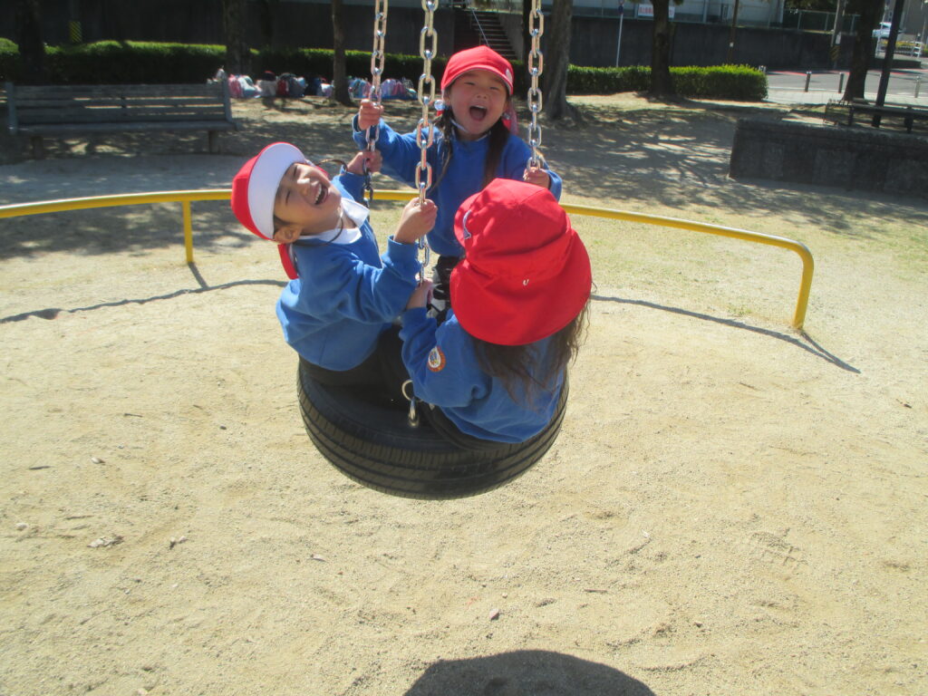 「先生、ブランコ押して」、「先生、見ててね」と、先生と一緒に過ごすことを喜んだり、近くの友達と笑い合ったりしながら、笑顔いっぱいの子どもたちでした。