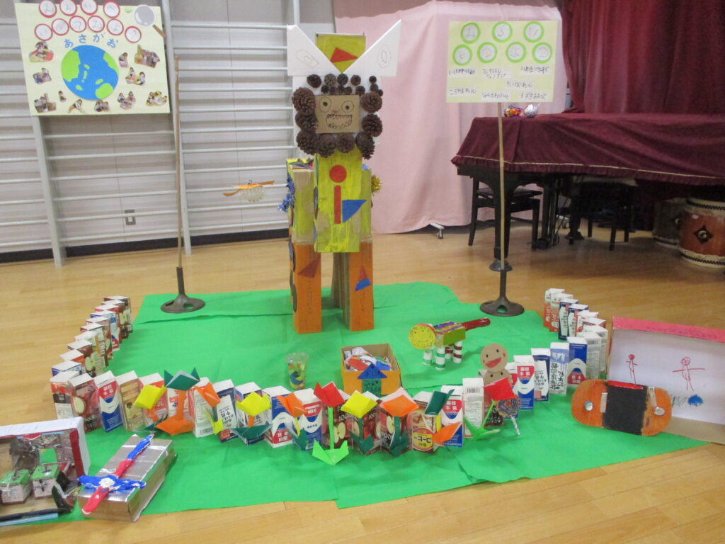 年長組は数人の友達とのグループ作品も作りました。「ここは何色がいいかな」と話し合ったり、「押さえてるからくっつけて」と力を合わせたりして、友達と一緒に一つのものを作りあげることを楽しんでいました。