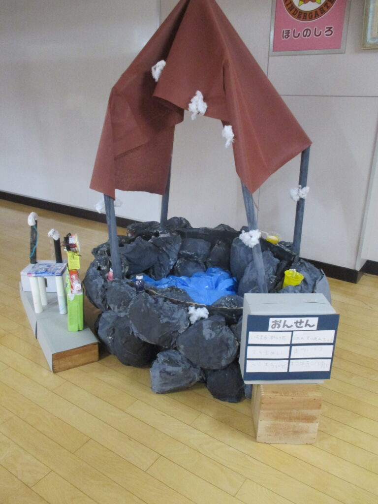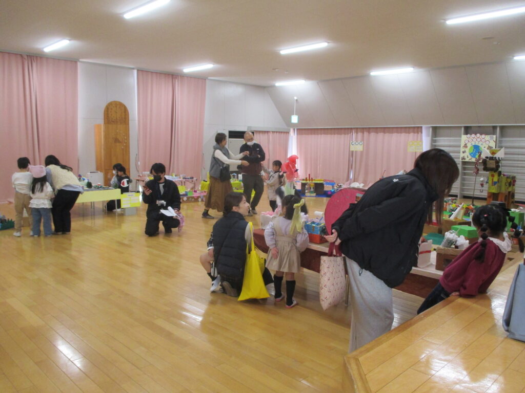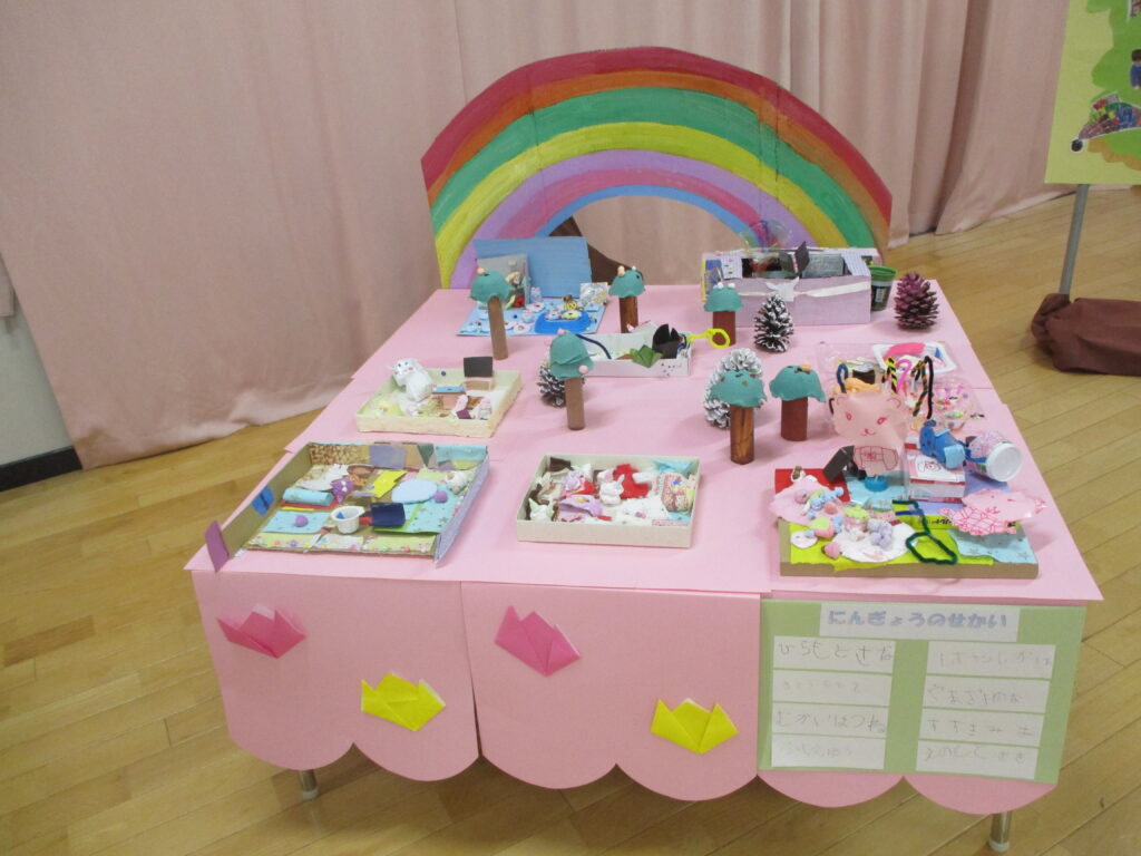 立体作品では、『こんなふうにしたい』という思いやイメージをもって空き箱やリボン、包装紙、モール、ボタン、毛糸、粘土などの様々な素材から必要なものを選び、一つずつ丁寧に作りました。ごちそうやプレゼント、生き物、乗り物など、子どもたちのわくわくがたくさんつまった作品ができました。