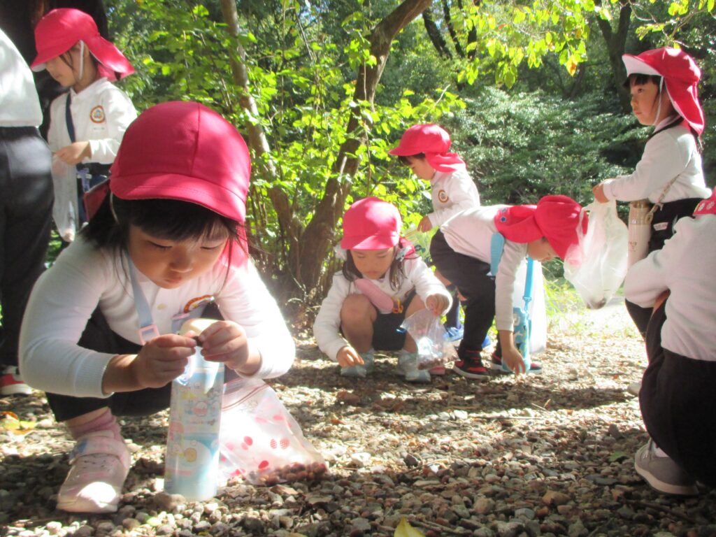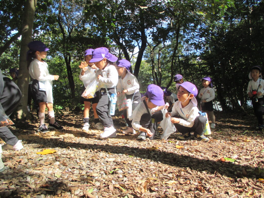 「どんぐりの帽子があったよ」「大きい葉っぱ見つけた!」と色々な秋の自然物を自分の袋に集めました。