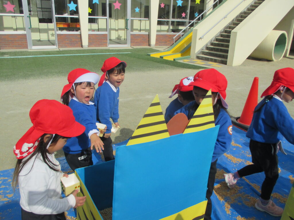 年中組・年長組の豆まきの時間には赤鬼(職員)もやって来て、子どもたちは逃げる鬼に狙いを定めて投げていました。