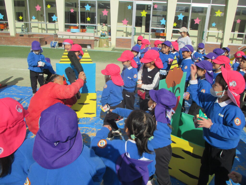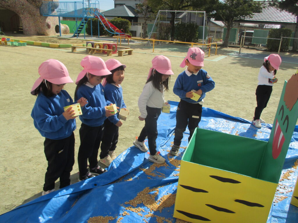 年少組・年中組・年長組は、園庭にいる泣き虫鬼、怒り鬼めがけて元気いっぱい豆を投げました。