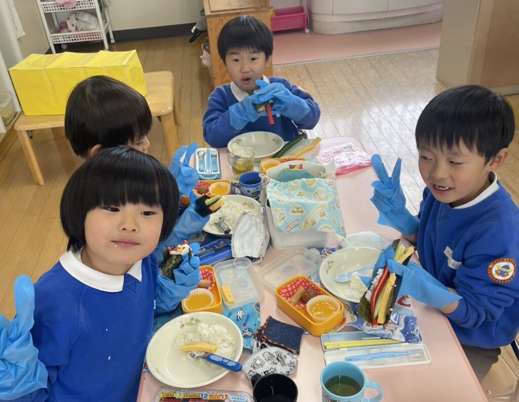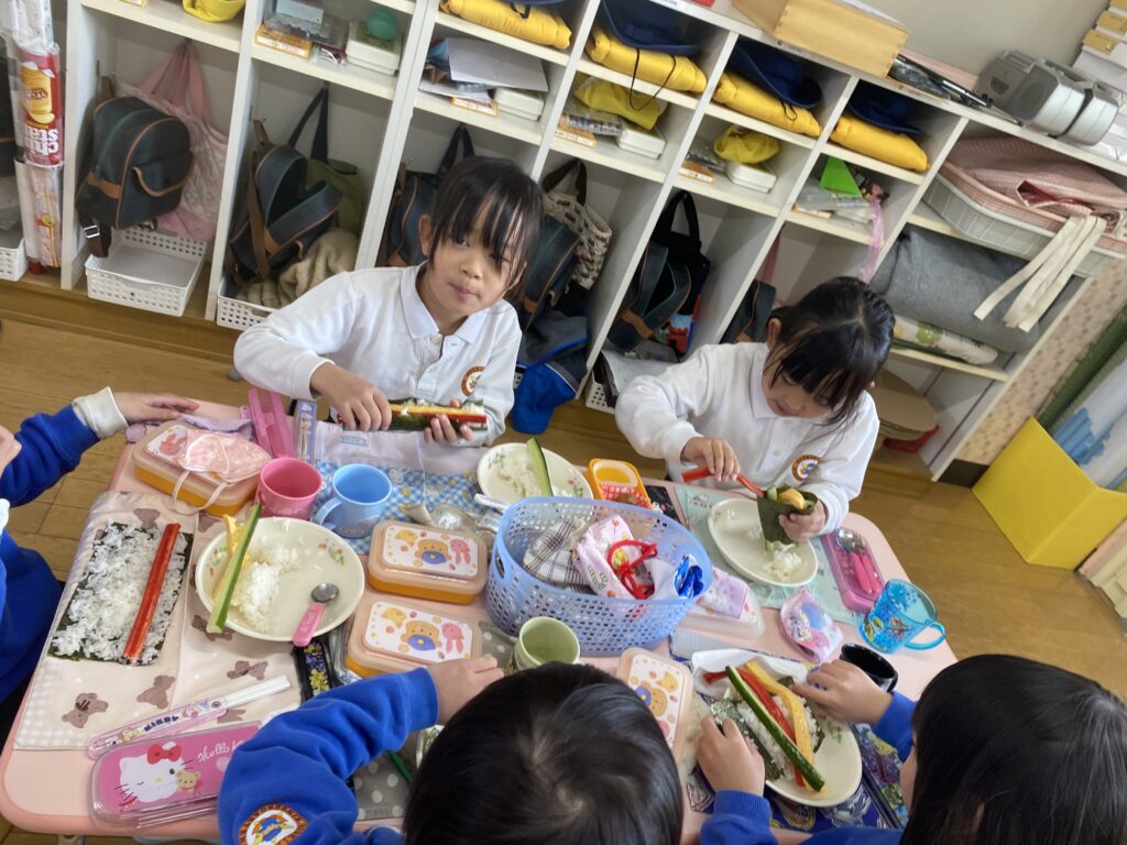 年長組は、自分で作った恵方巻きを食べました。のりにごはんと具をのせ、今年の恵方“南南東”を向き、願い事をしながら食べました。