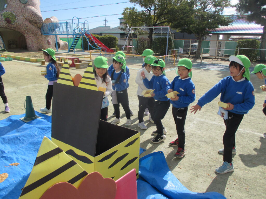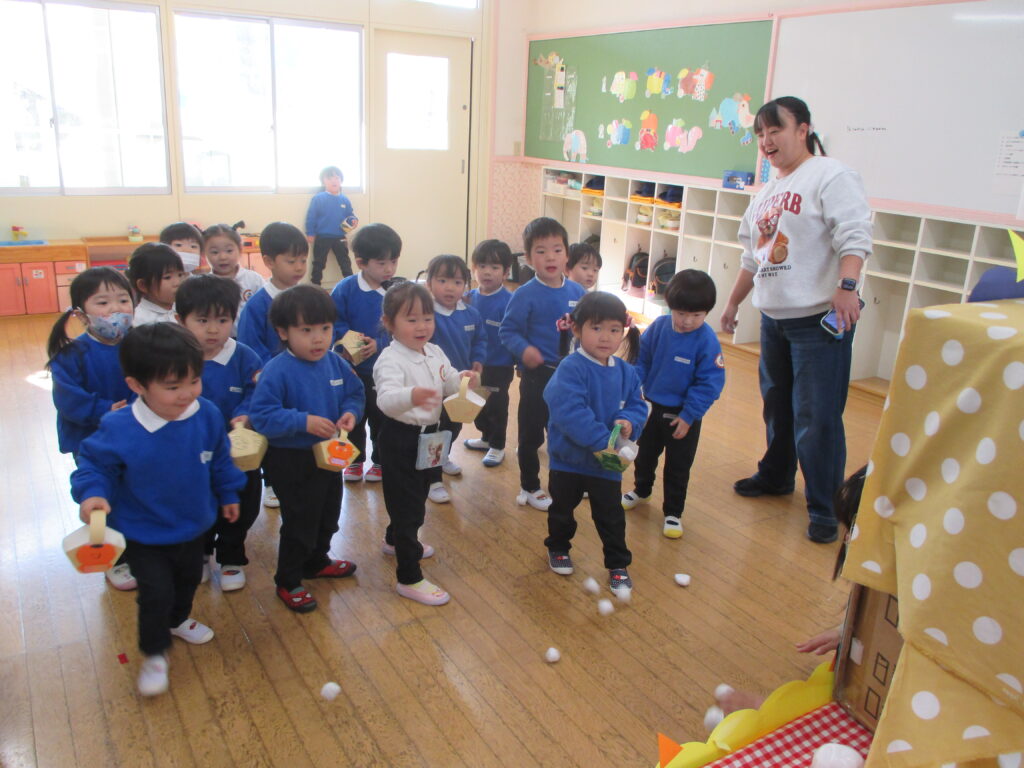 満3歳組は保育室・その他の学年は園庭で豆まきを行いました。