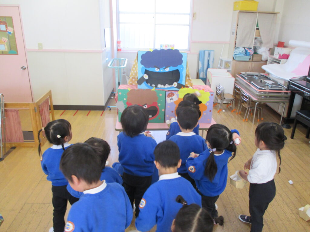 満3歳組は新聞紙で作った豆を使い、豆まきごっこを楽しみました。どの子も怖がることなく、「鬼は外!」「福は内!」と鬼の口めがけて投げました。