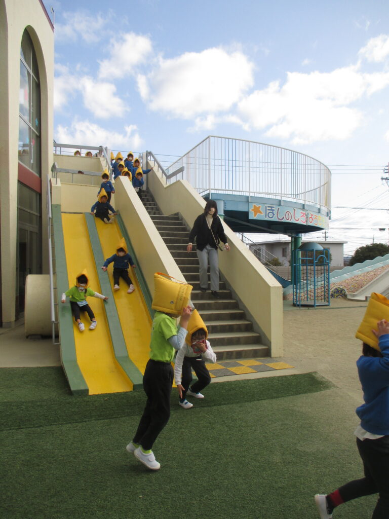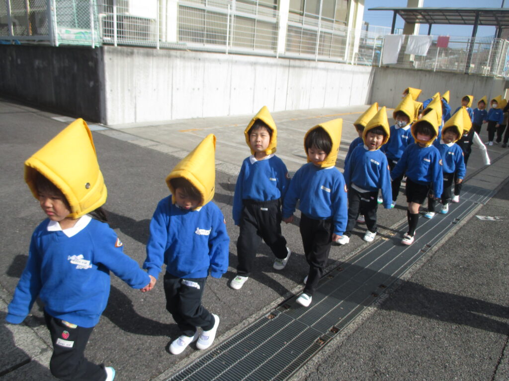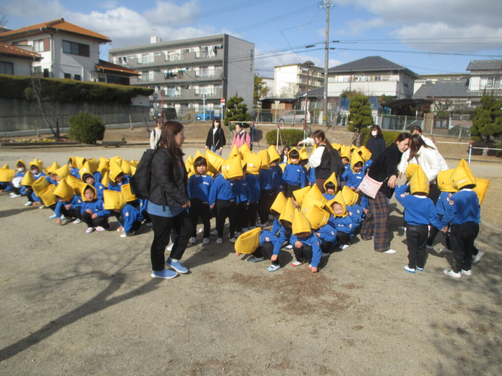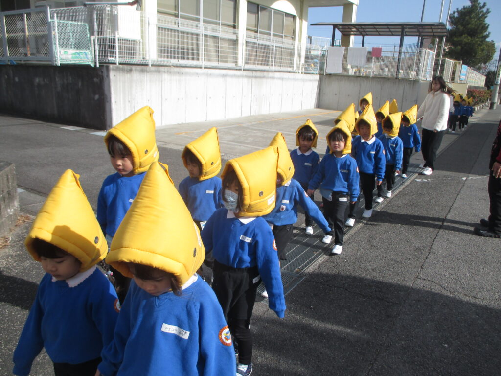 今年度最後の避難訓練を行いました。今回は幼稚園にいることが危険な状態という想定で、幼稚園の隣にある森裏公園への二次避難をしました。